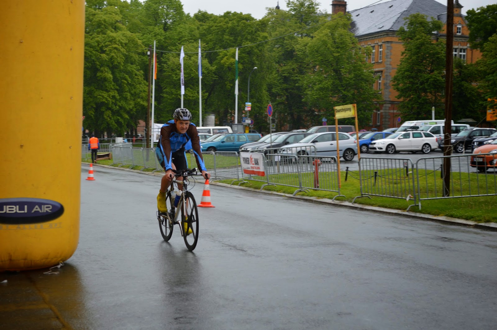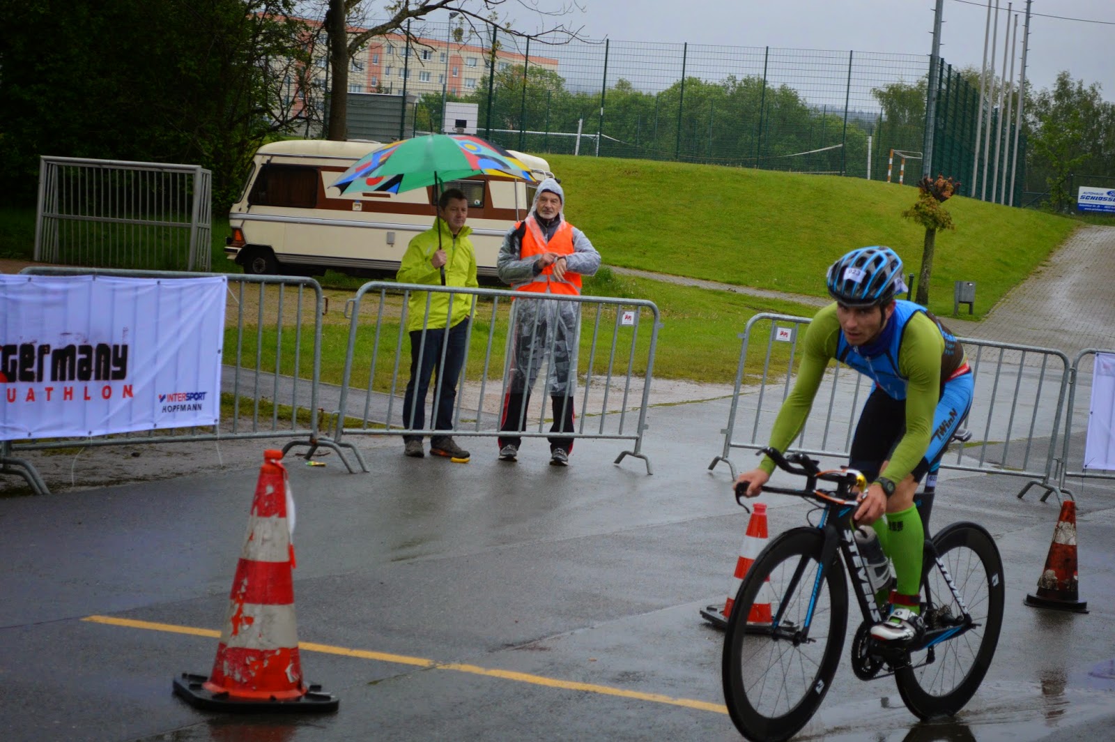 In der Wechselzone angekommen wurde mir das Regenwetter erst richtig bewusst. Meine deponierten Klamotten waren bereits patsch nass und in die Tüte mit den Radschuhen lief es auch schon rein. Aber noch war ich positiv gestimmt. Sogleich schnappte ich mir mein Rad und strampelte durch Falkenstein. Gleich zu Beginn musste eine von zwei „Rampen“ auf der Strecke bezwungen werden, wohl dem der auf ein anderes Ritzel setzte, ich natürlich nicht :). So wurde mir wenigstens schön warm. Bei Km 16 befand sich der erste Wendepunkt und kurz zuvor kam die zweite Rampe, nun aber erst mal bergab. Hier wurde mir das Ausmaß des Dauerregens erst richtig bewusst. Der Rettungswagen überholte uns bereits mit Blaulicht und ein Radler lag in der ersten Abfahrtskurve im Graben und versorgte seine Schürfwunden. Noch fühlte ich mich gut und ließ mich von den Vorfällen nicht verunsichern.