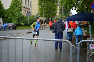 Die Laufstrecke führte zuerst durch Falkenstein und anschließend ein steiles Stück bergab in eine Talsenke. Ab hier ging es die nächsten 6 km bis zur Wendemarke nur noch bergauf. Gleich zu beginn schloss ich mich mit Andreas Meier zusammen und wir beschlossen die bergauf-Passage in einem moderaten Tempo anzugehen. Bei Km 4 überholte uns ein Konkurrent mit heftiger Schnapp-Atmung. Na ob das die richtige Wettkampftaktik ist? Egal, es ging weiter bergauf und der Regen hielt auch nicht locker. Angekommen an der Wendemarke stellten wir fest, dass unser drittes Team-Mitglied, Reinhold Schmidpeter, uns in nur 200 m Abstand gefolgt war. Aber nun ging es für 5 km bergab und „Laufen lassen“ war angesagt. Auf den letzten 2 km zog Andi das Tempo nochmals an. Ich lies ihn erst mal laufen und versuchte meinen Puls konstant zu halten.