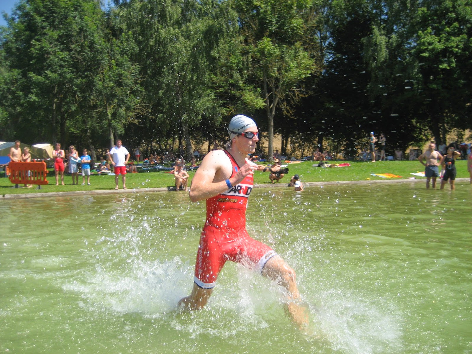 Pünktlich um 14:00 Uhr fiel der Startschuss im Altenveldorfer Badeweiher. Es wurde ohne Neoprananzug geschwommen. Schmidt versuchte das Tempo zugleich sehr hoch zu halten und führte die ersten 200m das Feld an. Dann ließ er jedoch Sebi Neef vorbei – warum soll man auch die Führungsarbeit ganz alleine machen 🙂 Nach gut 18min entstieg Schmidt als erster der TWin Athleten den Fluten. Dicht gefolgt von Sebastian Bauer, welchem nur wenige Sekunden dahinter Philipp Christl folgte. Soweit so gut. Christl befand sich nach seiner vermeintlich schwächsten Disziplin in Schlagdistanz zu Schmidt. Er war nun der Jäger, er konnte Taktieren. Doch zunächst galt es die ca. 3min Vorsprung die Schmidt hatte aufzuholen und diesen, wenn möglich, noch am Rad zu stellen. Doch Schmidt setzte gekonnt seine ca. 5kg Übergewicht ein und machte richtig Druck. Sebastian Bauer wollte, konnte aber nicht – die Hitze liegt ihm einfach nicht. Laut seinen eigenen Aussagen „ging am heutigen Tag beim Radln und Laufen mal wieder rein garnichts!“.