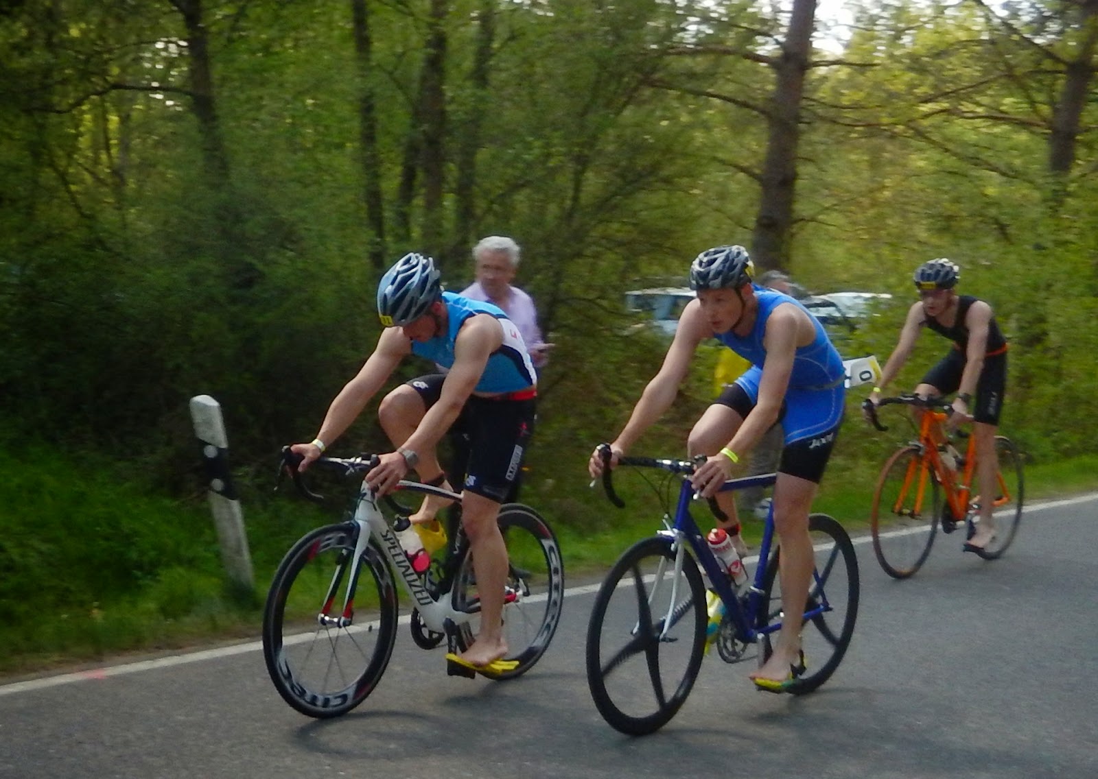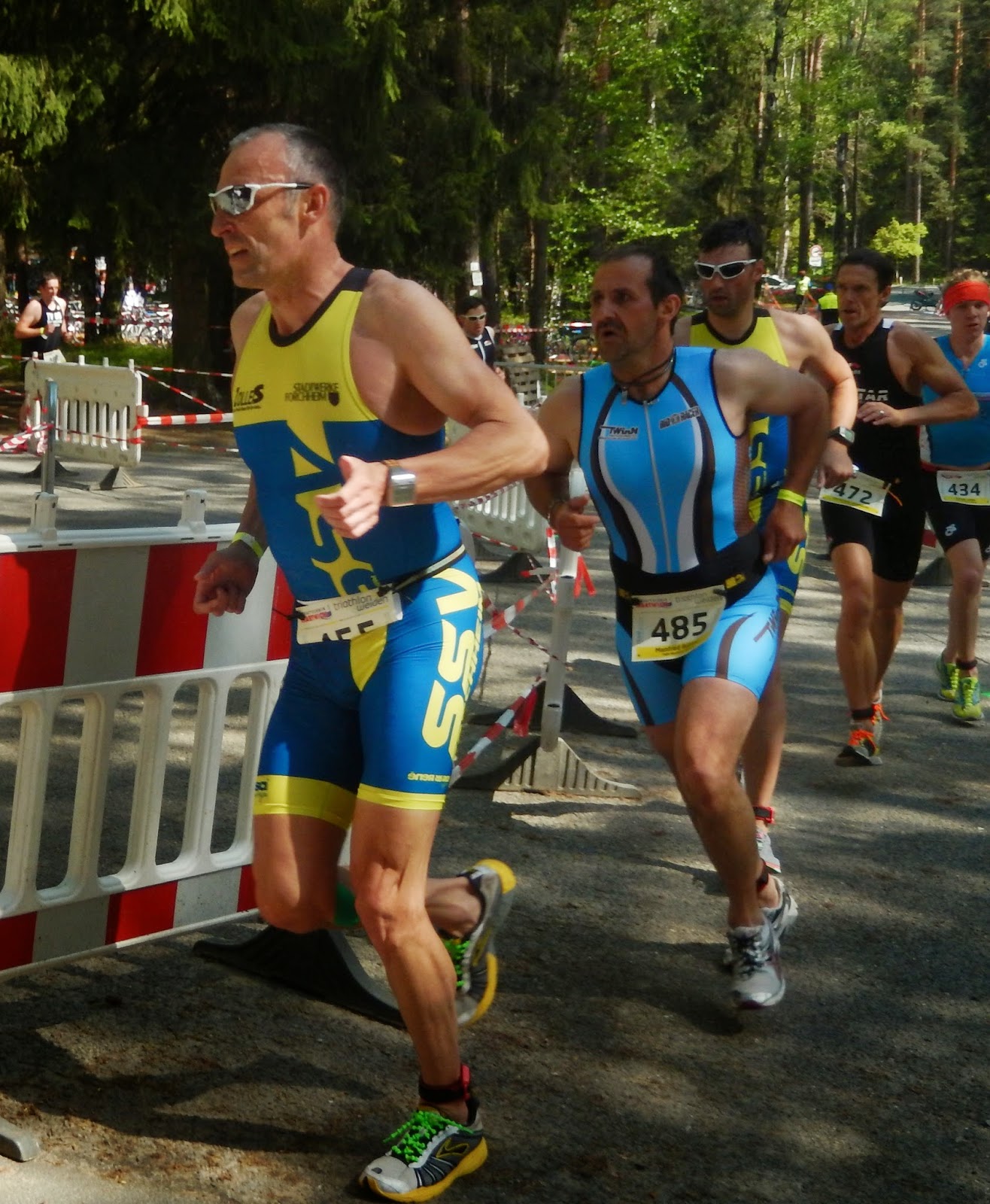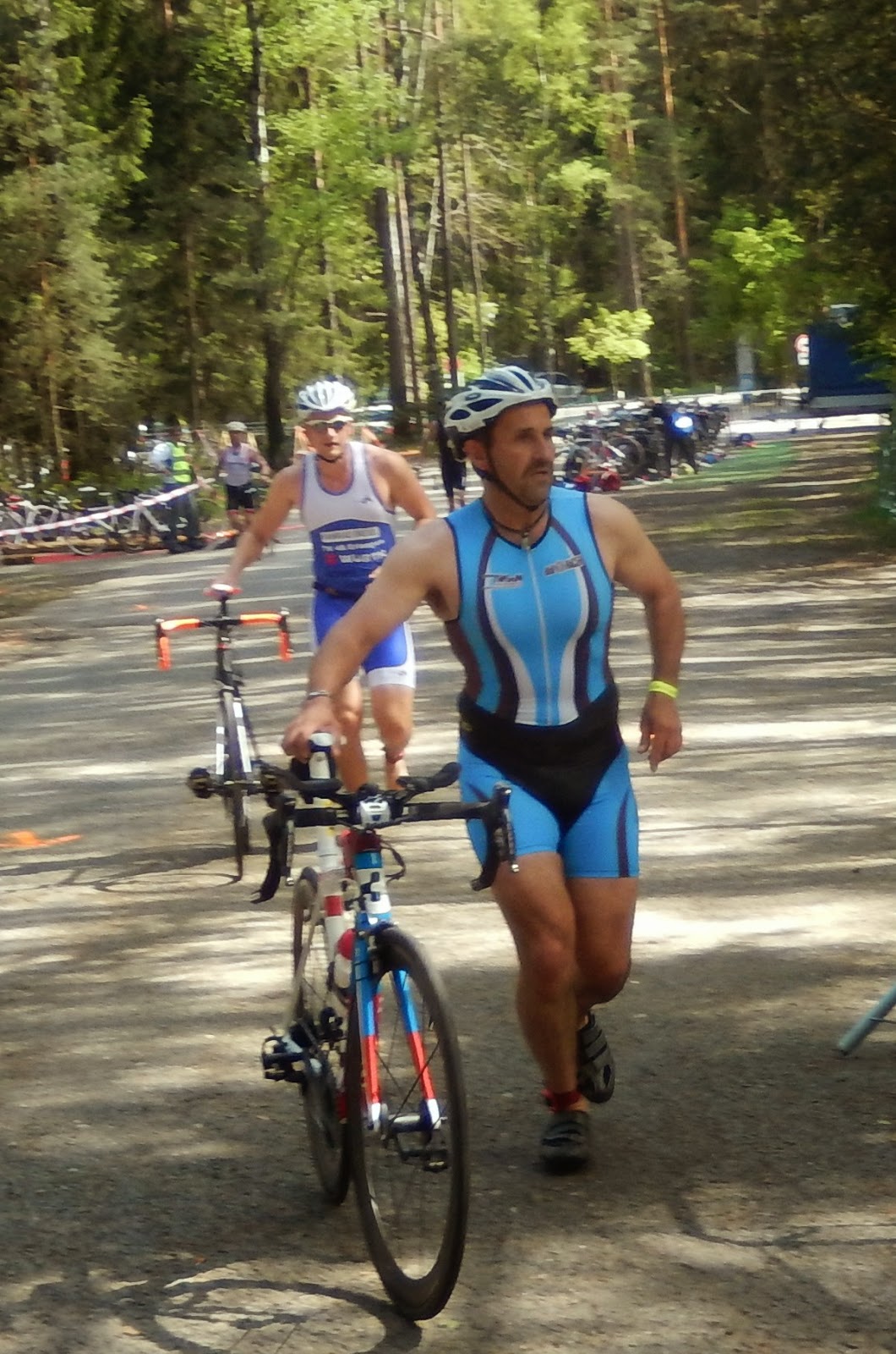 Nun aber zum eigentlichen Wettkampf. Bergmann, der als starker Schwimmer bekannt ist, absolvierte die 750 Meter Schwimmen geschlossen mit seinem Amberger Team in einer Zeit von 11 Minuten, inklusive Wechsel. Nun war Büttner und Schmidpeter gefragt den Abstand möglichst gering zu halten. Manfred konnte bereits eine Minute später folgen und vollzog einen sehr schnellen Wechsel. Reinhold war nochmals eine Minute später dran, aber absolvierte das Schwimmen mit einer persönlich sehr guten Zeit.