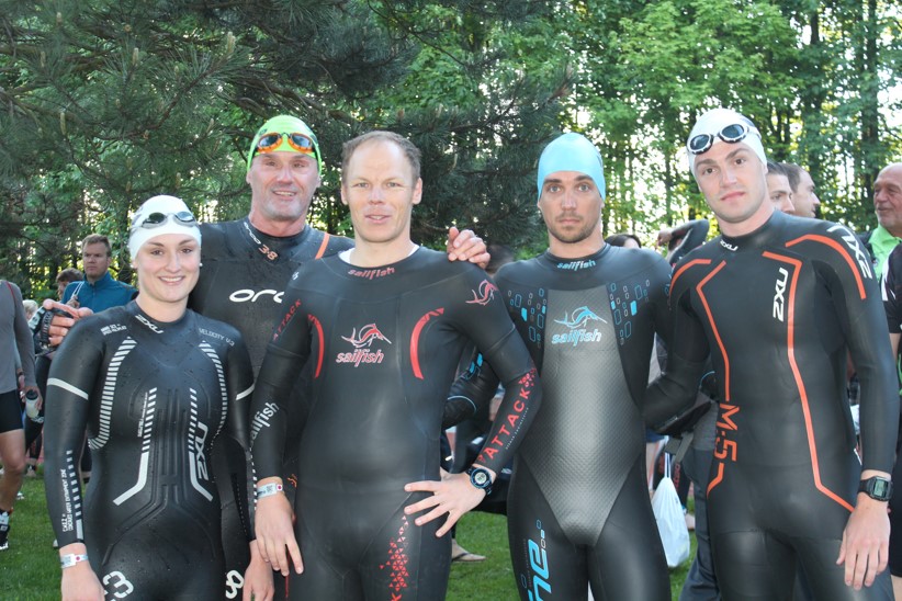 Nachdem die Profis bereits im Wasser waren konnten ab 7:10 auch die Altersklassenathleten starten. Alle 5 Sekunden sollten um die 10 Starter ins Wasser gehen. Das klappte meiner Ansicht nach ganz gut und dementsprechend gabs keine Schlägerei zum Start. Zunächst waren 1,1 km im Viehofner Weiher zu absolvieren, dann ein Landgang und weitere 800 Meter im Ratzedorfer Weiher. Nach dem Schwimmausstieg bemerkte ich sofort Jürgen der ca. 20 Meter vor mir aus dem Wasser gestiegen ist.