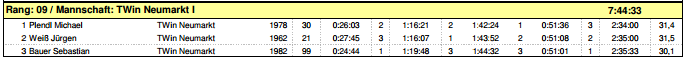 Ende der ersten Runde konnte Plendl auf Basti Bauer auffahren und ihn überholen. An der Wende sah man aber auch schon Jürgen Weiß heranfliegen. Mit 3 soliden, dem Trainingsstand entsprechenden, Radleistungen war dann die Reihenfolge beim Laufen Plendl vor Weiß und Bauer. Alles in allem gingen auf dem Rad einige Gesamtplätze verloren, die Platzierung im Teilnehmerfeld war jedoch immer noch vielversprechend.