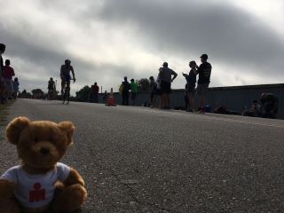 Und wie das losging. Die ersten Kilometer überholte ich schon zig Leute. Es gab keine Steigung und noch dazu Rückenwind. Die meiste Zeit war ich mit ca. 38km/h unterwegs. Wenn weniger Radler auf der Strecke gewesen wären wäre noch mehr gegangen. So musste ich aber immer sehr aufpassen, besonders in der Kurven. Nach der ersten Stunde (im 37er Schnitt) lichtete sich der Nebel und die Sonne gab Dampf. Ca 27 Grad waren es da schon. Beim Rad aber nicht zu spüren. Nun ging es die zweite Hälfte dann mit Gegenwind zurück und dann doch auch leicht bergauf. Sobald es bergauf ging war es mit den Amis vorbei. Am extremsten war es bei einem ca. 50 Meter langen 10% Anstieg. Ich sah eine Frau im stehen umfallen da sie den Gang nicht mehr treten konnte und 2 haben den Hügel raufgeschoben!! Sowas hatte ich echt noch nie gesehen. Mein Schnitt ging auf runter aber ich überholte immer noch Unmengen an Leuten. Richtung Wechsel spürte ich die Oberschenkel dann bereits aber durch das ständige Überholen konnte ich einfach nicht langsamer machen.
