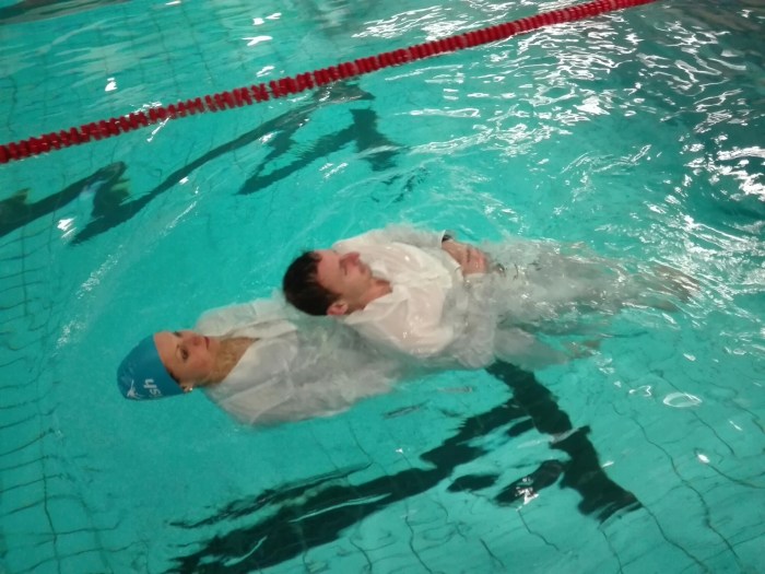 Die Teilnehmer mussten mit Bekleidung schwimmen, aus drei Metern Höhe springen, nach Gegenständen tauchen, Ertrinkende abschleppen, transportieren und bergen und sich im Umgang mit verschiedenen Rettungsmitteln vertraut machen.