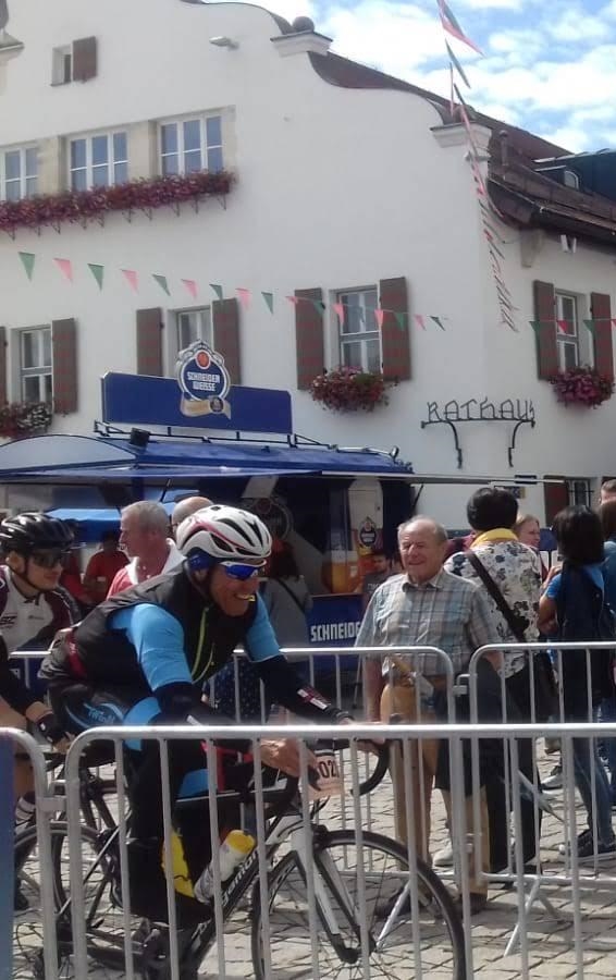 Am letzten Wochenende war es dann soweit. Pünktlich um 14 Uhr ertönte der Startschuss und es ging gleich den ca. 5 Kilometer langen Anstieg hoch Richtung Befreiungshalle. Dort hatten sich schon einige Vereine eingefunden, die „mächtig Stimmung“ machten. Auf dem höchsten Punkt der grünen Hölle bei 170 HM war Dieter von der Stimmung total begeistert. Dann kam die lange Abfahrt in Richtung Kelheim, wo Geschwindigkeiten bis 70kmh erreicht wurden. Eine Runde hatte 16,4 Km und jedes Mal musste in Kelheim das Festzelt unter dem Jubel der Zuschauer durchfahren werden.