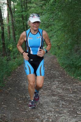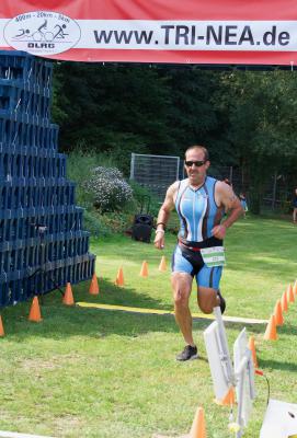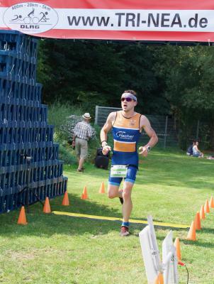 Nachdem in der Wechselzone die Radschuhe gegen die Laufschuhe getauscht wurden, ging es unter dem Jubel der Zuschauer in Richtung Stadtpark. Nach einer kurzen Steigung ging es auf einem schönen Waldweg etwa 1,3 km meist leicht bergab zum ersten Wendepunkt. Auf dem Weg dorthin lag auch die Verpflegungsstelle. Nach etwa 600 m ging es dann einen weiteren ca. 400m langen Anstieg hinauf. Danach führte die Laufstrecke die Athleten auf guten Waldwegen etwa 1,5 km zum nächsten Wendepunkt, von wo aus es dann „nur“ noch etwa 1 km meist bergab bis ins Ziel ging.