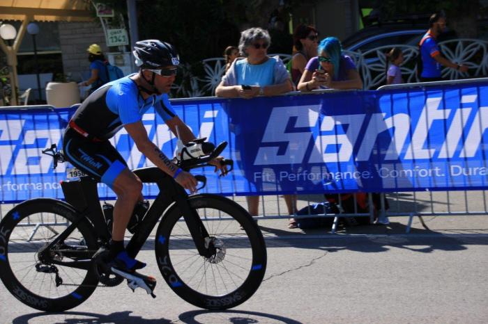 Ab diesem Zeitpunkt konnte es ja nur noch besser werden. Die ersten Kilometer verliefen auch sehr gut. Ab ca. 10 Kilometer hat sich jedoch der Sattel gelöst. Dieser ragte plötzlich mit der Spitze nach unten. Mittels Gewichtsverlagerung auf den hinteren Sattelbereich hat Michael ihn wieder in die Waagerechte gebracht. Da diese Prozedur bei jeder größeren Bodenunebenheit notwendig war, war der Sattel dann nach ca. 40 km vollständig locker. Daher musste ein Boxenstopp eingelegt werden, um den Sattel zu fixieren. Dieser Boxenstopp kostete Michael 6 Minuten und es dauerte auch noch ein paar Kilometer bis er seinen Rhythmus wieder gefunden hatte. Jedoch war der Sattel schon bald wieder locker und die Nase neigte sich wieder nach unten. Michael entschied sich dazu, in dieser Position das Rennen zu Ende zu fahren. Insgesamt war die Strecke, welche im Vergleich zum Vorjahr leicht modifiziert wurde, wenig anspruchsvoll. Auf ~181 km mussten lediglich 840 Höhenmeter überwunden werden. Michael beendete den Radpart schließlich nach 5:08:18.