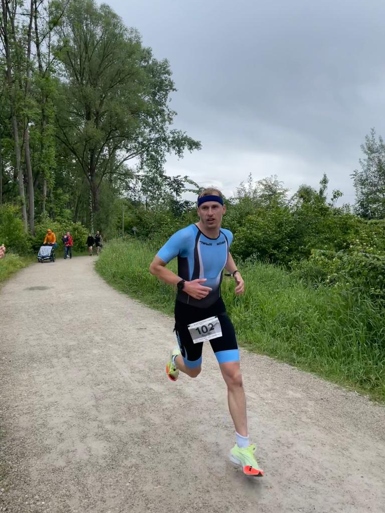 Beim Schwimmen im ziemlich klaren Wasser hatte Flo die besten Arme erwischt und war mit gut 32min schnellster Neumarkter, dicht gefolgt mit knapp 2min Abstand von Luke und Sebastian. Auch im Kraichgau herrschten nicht die wärmsten Temperaturen, sondern doch eher einstellige Temperaturen und teilweise Regen. Dieser Umstand und die angesprochene anspruchsvolle Radstrecke mit vielen Höhenmetern setzte den Athleten zu. Auch auf dem Rad setzte Florian Bader die beste Zeit aller TWinler, aber Luke und Sebastian gaben sich auch auf den 90km im Sattel wenig zeitlichen unterschied. Somit war klar, dass es im Laufen entschieden wird, wer die kleine interne Vereinswertung für sich entscheiden wird. Euphorisiert von den vielen Zuschauern versuchte Flo solange es ging seinen Schnitt zu halten und sich gut zu verpflegen. Bis Kilometer 17 ging das auch gut, doch dann holten ihn Krämpfe in beiden Oberschenkeln ein und sein Vorsprung auf das Verfolgerduo begann zu schrumpfen. „Eine Cola rettet mich“ meinte Flo und kämpfte sich ins Ziel und brachte den Lauf dennoch in 1:34h ins Ziel und brauchte insgesamt 4:49h. Im Ziel war er erst mal überrascht, da er während des Rennens nichts davon wusste, dass er der schnellste Windschattler sein sollte. Kämpfen kann er der Flo 😉