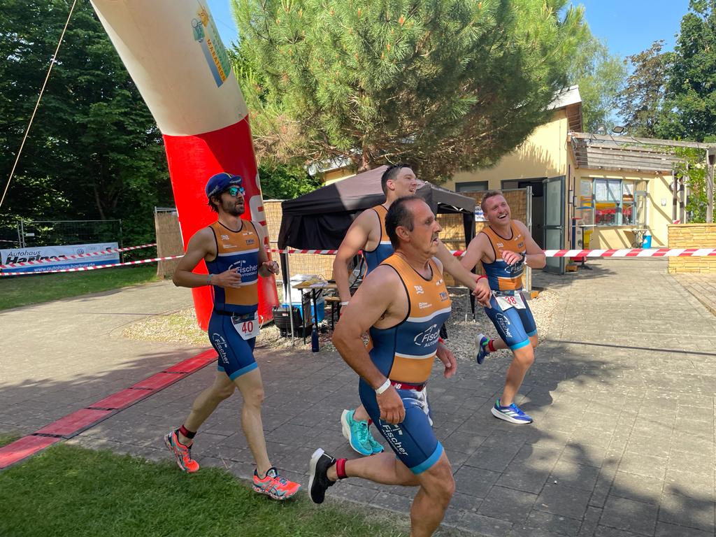 Der erste Startschuss fiel um 9:00 Uhr als sechstplatzierte Mannschaft mit einem Wasserstart. Manfred Büttner führte die 4-er Kette und gab das Tempo an. Der Teamgeist hielt auf den 600 m soweit, das hierbei sogar der 2 Minuten Abstand auf die Vordermannschaft aufgeholt wurde. Die vier Triathleten machten beim Schwimmen eine Platzierung gut. Raus aus dem Wasser und gleich auf die Laufstrecke ging der Wechsel reibungslos. Manfred Büttner war bei der ersten 2,5 km Laufstrecke stark und gab das Tempo vor. Teamkollege Bastian Eberwein kämpfte trotz seiner eigentlichen Off-Season mit voller Kraft und Unterstützung durch Armin Bauer und Dominik Daum, welche Ihn die letzten 1,5 km schieben und zogen um gemeinsam ins Ziel zu eilen. Der Einsatz hatte sich gelohnt. Nach dem swim/run am Morgen waren die TWin´ler nach 24:02 Minuten auf Platz 5 von 6. Auch am Nachmittag hat die Mannschaft taktisch gemeinsam um jede Sekunde gekämpft. Auf dem Rad leistete Bastian Eberwein, bekannt für seine Radstärke, den größten Teil der Arbeit. Er fuhr die ersten beiden Runden mit einem Schnitt von 340 Watt die Mannschaft durch den 5 km Rundkurs. Man beachte, das Bastian Eberwein mit lediglich 2 Gängen fuhr, da die Schaltung Probleme machte. Nach spektakulären Manövern in S-Kurven und Führungswechseln auf der 18 km langen Strecke kamen die TWin Athleten leicht „überpaced“ in die Wechselzone. Basti ließ sich wie vor dem Start besprochen zurückfallen. Dominik Daum erhielt eine 10 sec. Zeitstrafe für Helm zu früh öffnen, welche er durch einen Sprint sofort wieder einholte. Durch die Mittagshitze wurde so manchem Athleten auf den Zahn gefühlt, wobei Manfred Büttner am stärksten zu kämpfen hatte. Der Ultracyclist zog es jedoch der Mannschaft zuliebe durch und wurde mithilfe von Armin Bauer und Dominik Daum mit einer guten Zeit von knapp 45 Minuten ins Ziel geschoben und gezogen. Jener Einsatz ist bei Teamwettkämpfen besonders wichtig, da sonst empfindliche Zeitstrafen drohen. Belohnt wurde der Kampf für die Neumarkter Triathleten mit einer vierten Gesamtplatzierung in der jetzigen Tabelle der Landesliga-Nord.