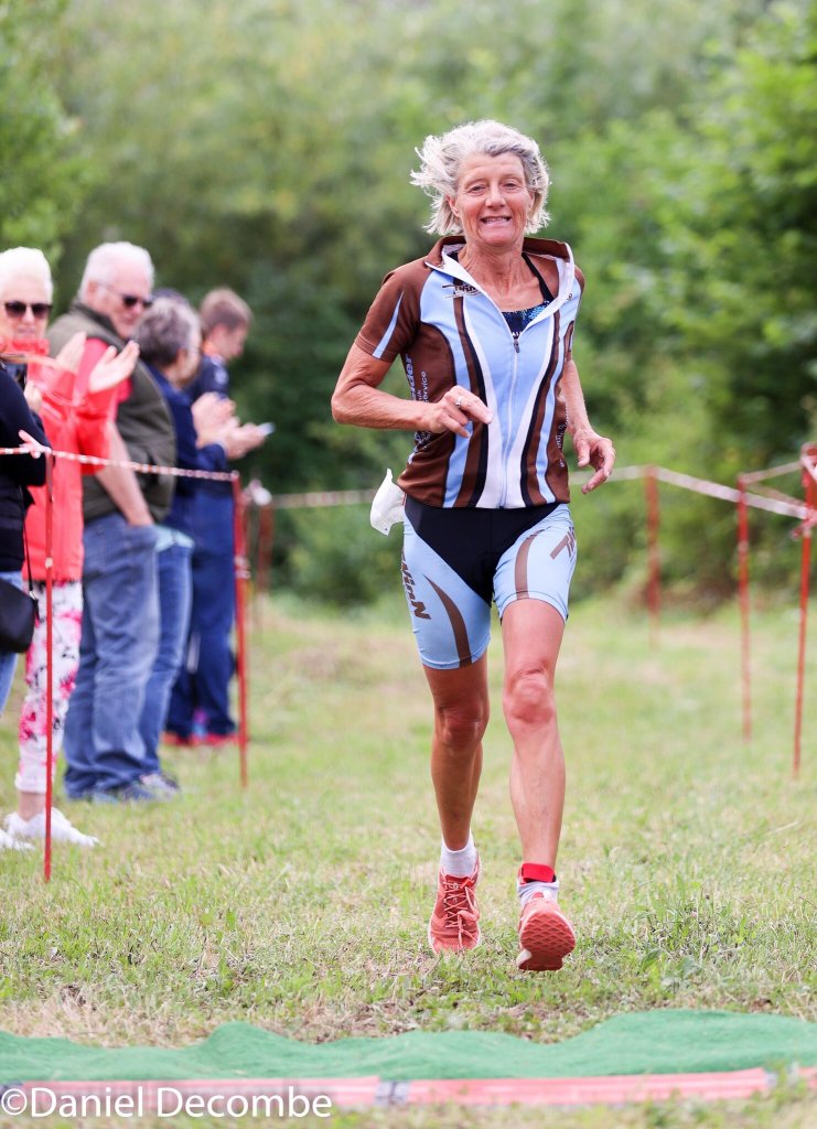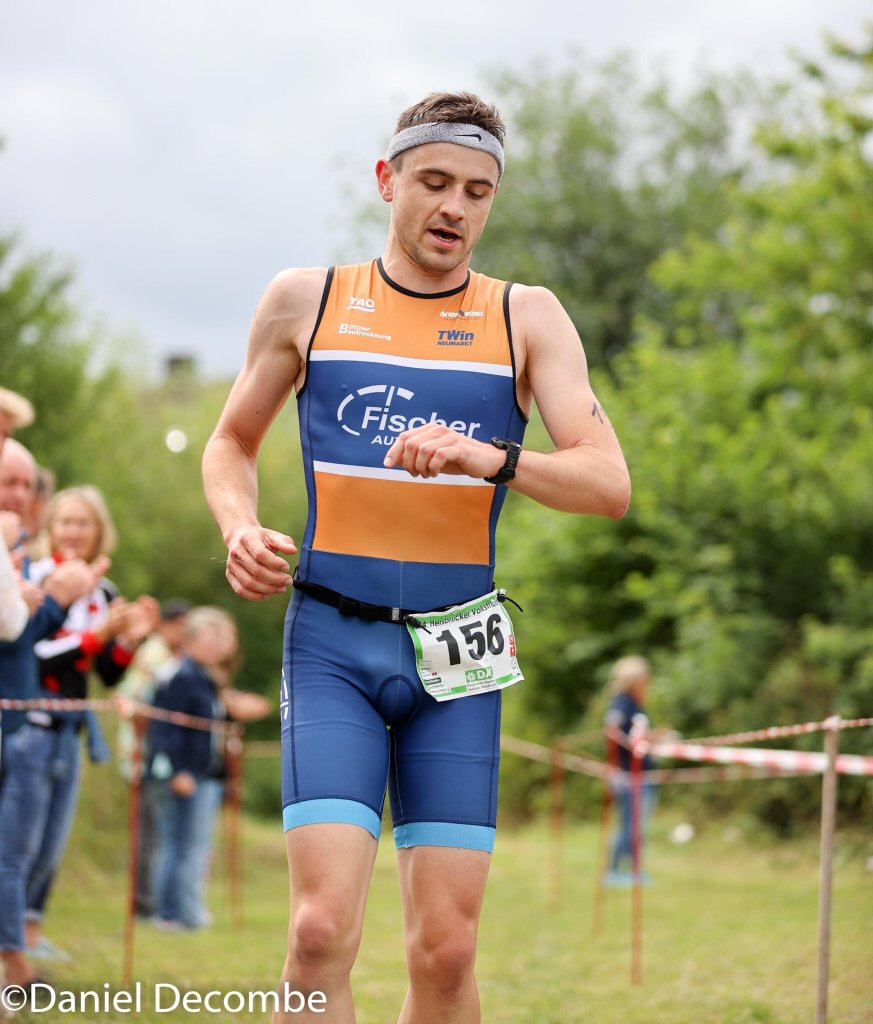 Die Radstrecke führte für alle Triathleten über Förrenbach, Thalheim, Alfeld, Nonnhof, Wörleinshof, Lieritzhofen nach Waller. Eine Anspruchsvolle Strecke, die bis auf ein paar wenige Meter immerzu bergauf ging. Daniel konnte nach dem Schwimmen mit einem schnellen Wechsel gleich als Gesamtzweiter aufs Rad und legte offensiv los. Auch Petra Stiegler gab viel Druck am Rad, bei nur 20 km für sie kein Problem und konnte viele Kontrahenten „einsammeln“. Der Neuling Matthias Flath absolvierte hier in Hersbruck erst seinen 3. Triathlon und freute sich, hier im Mittelfeld mitzufahren. Danach mussten alle ihr Rad in Waller abstellen und auf die 5 km lange Laufstrecke gehen. Daniel verlor auf dem Rad leicht an Boden und musste mit einer Minute Rückstand auf Platz 3 das Rad abstellen. Da er von dieser Minute nur 30sek aufholen konnte, belegte er den undankbaren vierten Gesamtplatz in einer super Zeit von 56min. Auch Petra Stiegler hatte nach dem Radfahren nur noch eine Mitstreiterin vor sich und überholte diese nach kurzer Zeit. Sie musste jedoch schnell weiterlaufen, da ihr die Konkurrenz dicht auf den Fersen blieb. Alles lief wie am Schnürchen und so konnte sie nach 1:07 Std. die Ziellinie überqueren! Somit hat sie einmal mehr der jungen Konkurrenz ein Schnippchen geschlagen und sich einen weiteren Sieg ergattert! Ausgepowert und glücklich kam nach 1:20 Std. Matthias ins Ziel und das Trio vom Windschatten Neumarkt war komplett.