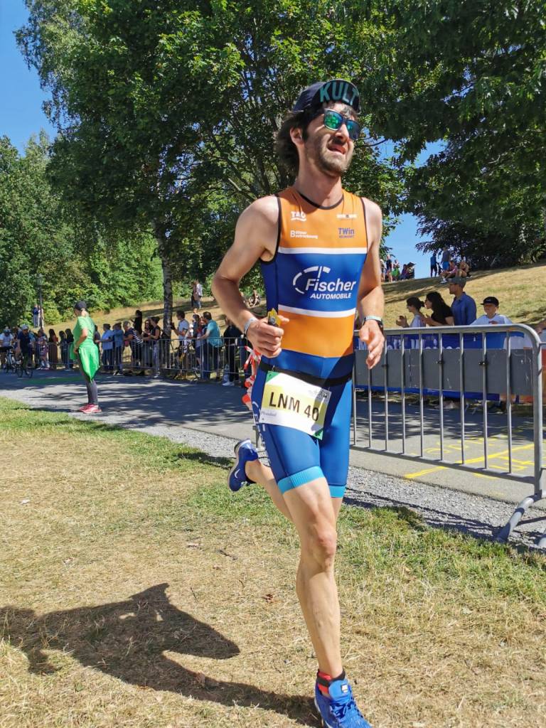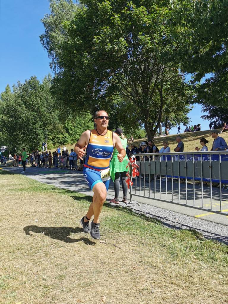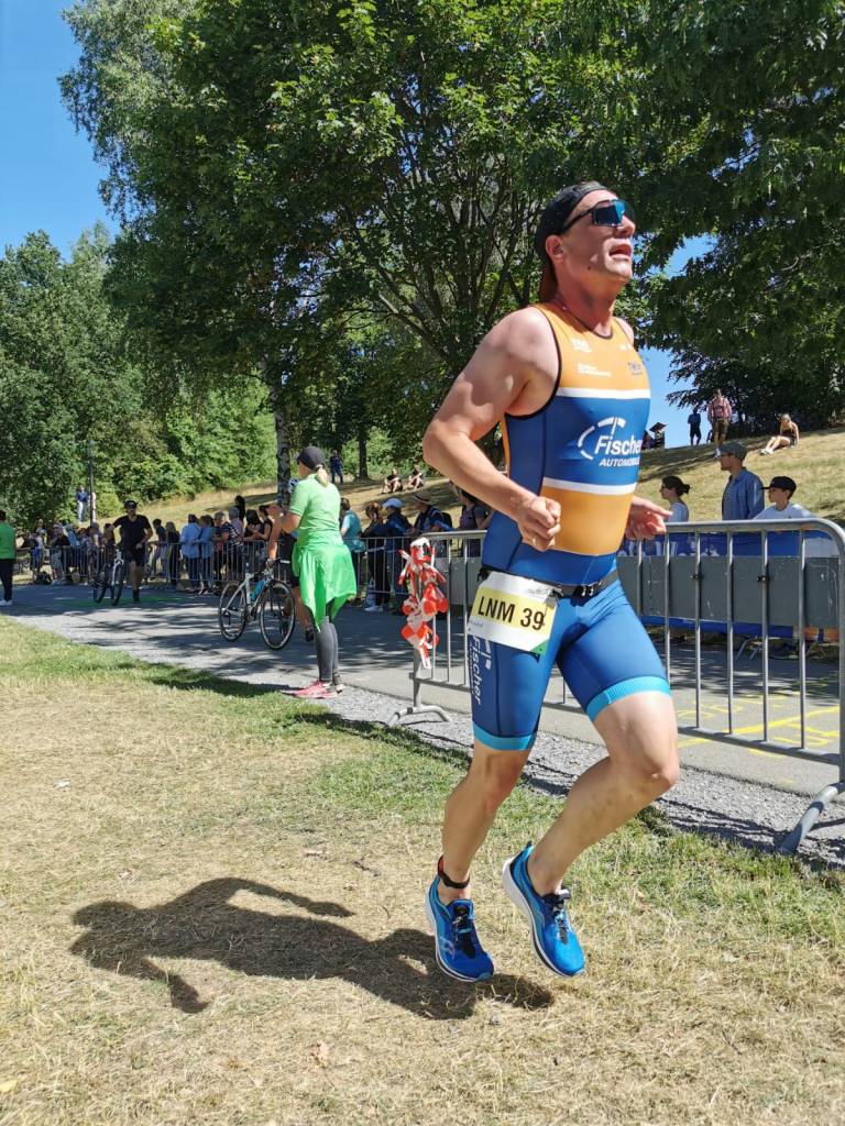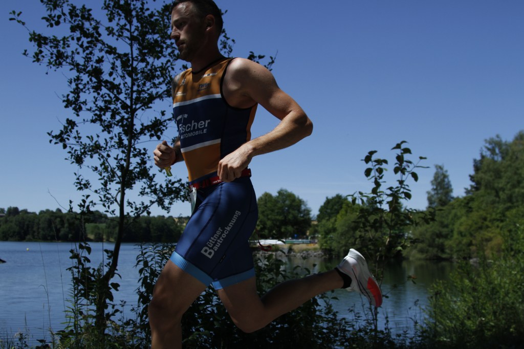 Um 9:55Uhr ging es für die Landesliga-Nord rein in den Untreusee und auf ins Getümmel. Für diesen Wettkampf waren an Bord: Armin Bauer, Christoph Ostalecki, der Nimmersatte Manfred Büttner und Michi Fuchs ließ es sich nicht nehmen und sprang als vierter Mann in die Presche um für den Notfall vorzusorgen. Auch wenn er mit Abstand zu den ältesten Startern gehörte kam Manni Büttner dennoch innerhalb der ersten 15 aus dem Wasser. Armin und Christoph „Ossi“ folgten ihm ungefähr innerhalb einer Minute. Auch auf dem Rad ließ Manni nicht locker (natürlich mit vollem Lightweight-Laufradsatz ausgestattet) und behielt seine Position. Armin und Ossi konnten nicht viel Boden gut machen, kamen mit wenig Abstand in die zweite Wechselzone. Auf der Laufstrecke musste Manni endgültig die Jüngeren ziehen lassen. Wurde von seinen Teamkollegen auf dem letzten Kilometer noch überholt und so kam das gewertete Trio mit den Plätzen 19 (Armin), 21 (Ossi) und 25 (Manni) ins Ziel. Michi Fuchs, der aufgrund von Verletzungen und Krankheit kaum zum trainieren kam, wurde dennoch 32.!