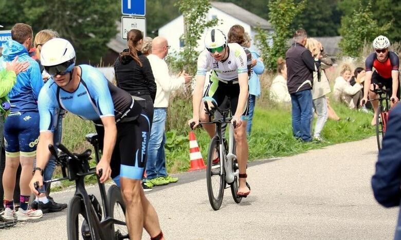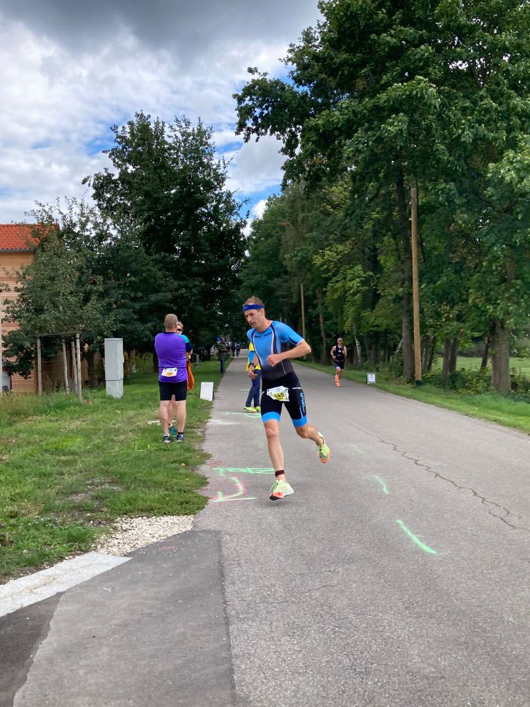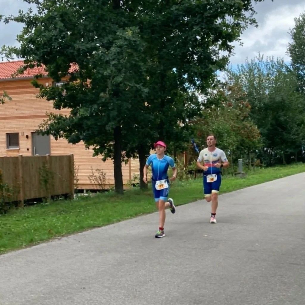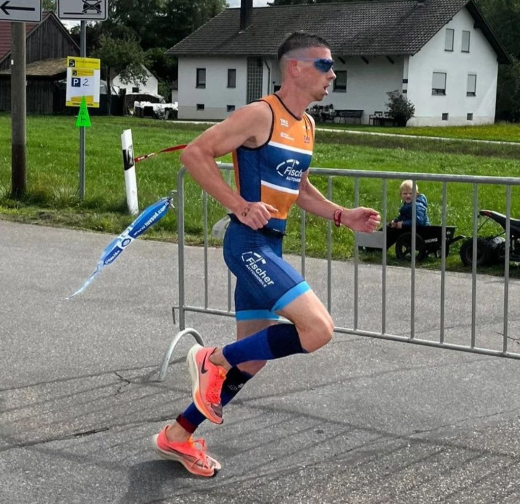 Auf der Sprintdistanz (750m Schwimmen – 26km Rad – 5,8km Laufen) hatte der Twin mit Marco Benz und Thomas Wittmann zwei heiße Eisen im Feuer. Ein Blick in die Starterliste des Männerrennens hat Szeneinsidern bereits ein hochkarätiges Rennen versprochen und so sollte es auch kommen. Wie gewohnt konnte die Twin-Athleten beim Schwimmen nicht an der absoluten Spitze mitmischen, Thomas kam an zehnter Stelle aus dem Wasser und Marco auf Platz 36. Beide legten auf dem Rad gleich offensiv los und so konnte Thomas den Anschluss an die ersten Verfolger herstellen, hielt sich aber taktisch noch etwas zurück, da sich alle späteren Sieganwärter um ihn herum befanden. Unter anderem Julian Hegel aus Hersbruck, der ab nächstem Jahr in der Regionalliga dann kein Konkurrent mehr ist, sondern auch für den Twin starten wird. Mit einer gewohnt guten Radleistung konnte auch Marco Plätze gut machen und schob sich auf Rang 13 vor. Innerhalb weniger Sekunden kam das Verfolgertrio bestehend aus Thomas Wittmann, Julian Hegel und dem starken Amberger Läufer Noah Treptow fast geschlossen in die zweite Wechselzone und es bahnte sich eine rasante Laufentscheidung an, denn alle drei Athleten haben dort ein Pfund. Thomas „UD“ Wittmann, der sich momentan in der Vorbereitung auf die Ironman 70.3 WM in Utah vorbereitet sorgte mit einem ersten Kilometer knapp über 3min gleich mal für eine kleine Vorentscheidung. Mit der schnellsten Laufzeit holte er bald den bis dahin Führenden ein und durfte als Gesamtsieger als erster den Ziekanal durchlaufen! Marco konnte mit einer wieder einmal starken Aufholjagd in den Laufschuhen noch Platz acht ergattern und gewann außerdem die AK 40. Er bereitet sich jetzt auf einen abschließenden Herbst-Marathon vor.