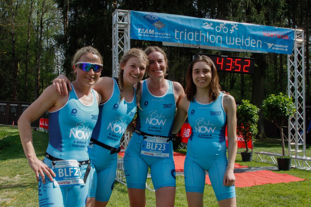 Den Anfang, bei einer Vielzahl von Starts, machte die neugegründete Damenmannschaft des TWin-Neumarkt in der Bayernliga. Sie hatten einen Doppelstart und mussten am Morgen eine Supersprintdistanz als Prolog bewältigen. Im Abstand von fünf Sekunden wurden die Athletinnen in das Rennen geschickt und durften im mit 16 Grad extrem kalten Wasser die erste Disziplin bewältigen. Astrid Werner und Leonie Brückner kamen mit den schwierigen Bedingungen gut zurecht und hielten sich im vorderen Drittel auf. Marina Bierschneider und Sabrina Erhardt hielten mit Mittelfeldplatzierungen gut mit. Astrid konnte mit einer Spitzenleistung auf dem Rad punkten, Leonie musste leider etwas einbüßen und Marina konnte satte zehn Plätze gut machen. Großes Pech hatte Sabrina, die bei einem Überholvorgang durch ein Ausweichmanöver einer anderen Athletin zu Sturz kam, musste jedoch kaum Plätze einbüßen. Auf der abschließenden 1,7km Laufrunde gab Astrid weiter Gas und brachte eine Spitzenleistung, Marina landete im guten Mittelfeld. Leonie und Sabrina trennten nur wenige Sekunden und hatten sich ebenfalls gute Positionen erkämpft. Aus den Zielzeiten wurde der Mittelwert errechnet für die Mannschaftsverfolgung, die am Nachmittag folgte. Mit einem sechsten Platz unter 11 Mannschaften legten die Damen gleich gut vor bei ihrem ersten Ligarennen überhaupt.