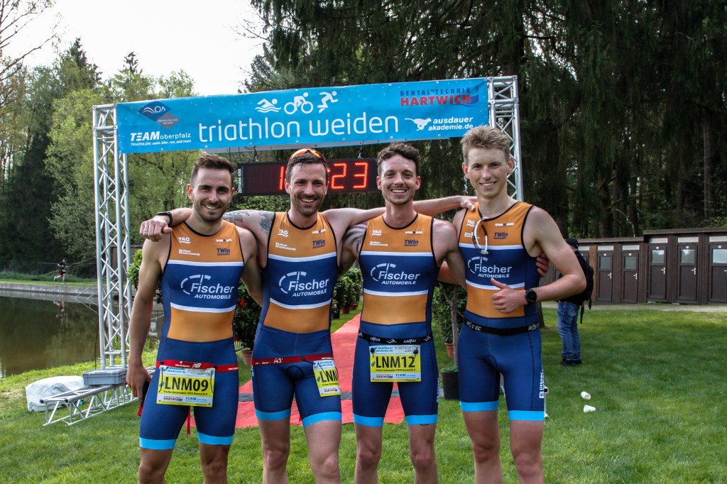 Wie im vergangenen Jahr im gleichen Rennen noch in der Bayernliga, durchlebten das Herrenteam der Regionalliga ein Wechselbad der Gefühle. Vor dem Schwimmen noch auf Platz eins mit 21 Sekunden Vorsprung vor der TGVA Augsburg gestartet, war dieser Vorsprung bis zum Wechsel aufs Rad komplett geschmolzen. Mit einem guten ersten Wechsel fuhr man jedoch weiterhin als erster auf die Radstrecke. Dort konnte man mit einer guten Zeit die Verfolger in Schach halten und donnerten mit knapp 45 km/h durchschnittlich über die kurvige Strecke. Die Konkurrenten aus Augsburg waren dem Quintett jedoch weiterhin sehr dicht auf den Fersen und so konnte man mit einem abermals schnellen Wechsel in die Laufschuhe wieder wertvolle Sekunden herausholen, die im späteren Rennverlauf noch wichtig wurden. Bis jetzt noch zu fünft unterwegs, war es jetzt auch erlaubt einen der Athleten sozusagen zu verlieren, diese Rolle sollte eigentlich Andreas Maier übernehmen. Da aber Daniel Reindl zu Beginn mit erheblichen muskulären Problemen zu kämpfen hatte und Maier das hohe Tempo nicht halten konnte, zogen die Augsburger an den Neumarkter Athleten vorbei und hatten ca. 50m Vorsprung. Da sich Daniel aber zurück kämpfen konnte und seine Laufbeine wieder fand ging es für die mittlerweile nur noch vier Athleten an die Verfolgung. Den Sieg vor Augen rückte man immer näher heran und konnte schließlich 1km vor dem Ziel wieder die Führung übernehmen und diese bis ins Ziel auf knappe achte Sekunden ausbauen.