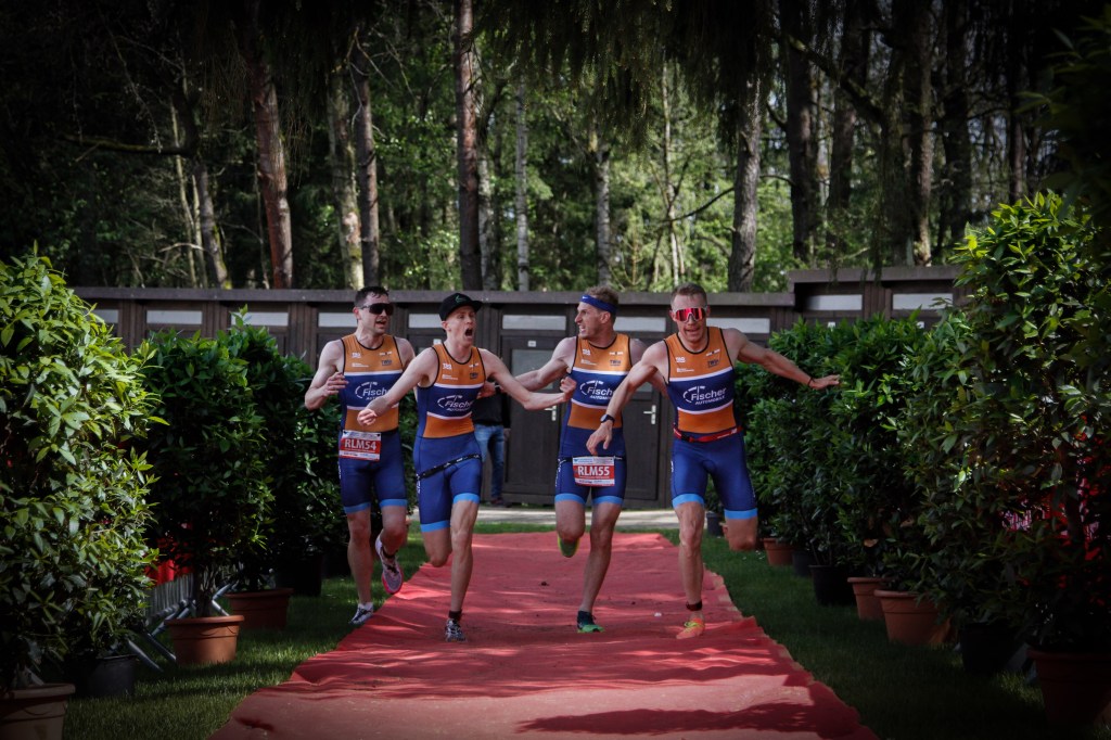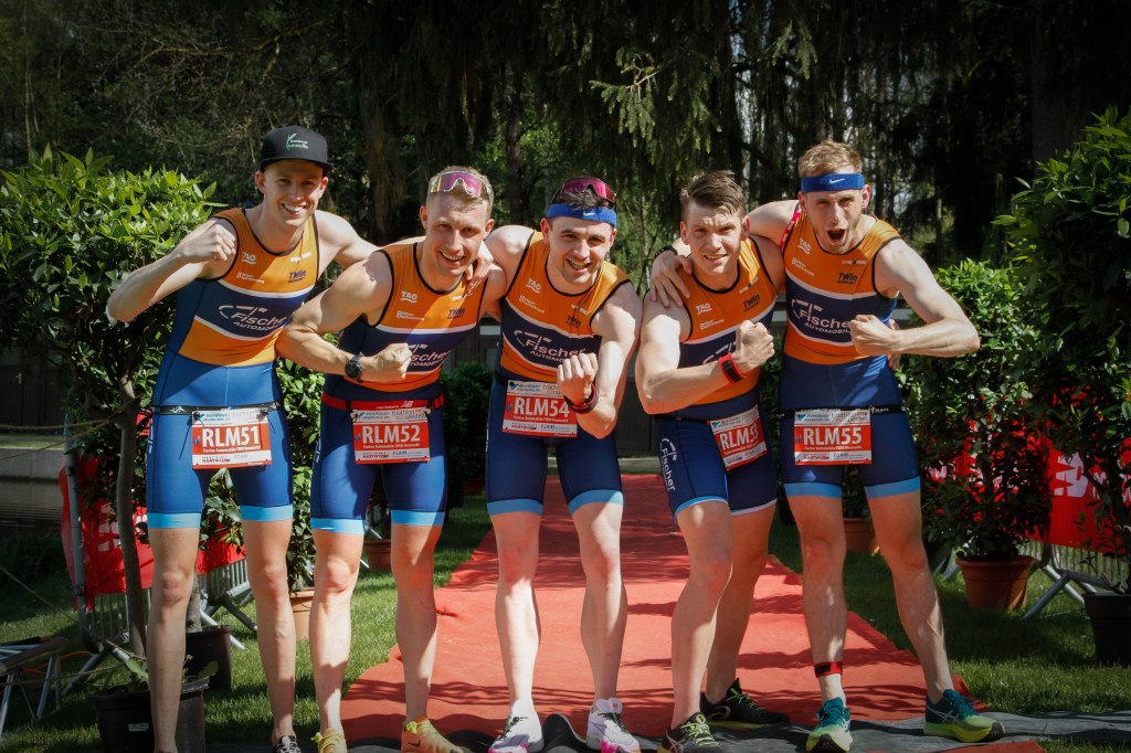 Gut 20 Minuten nach den Damen, stand dann für das Regionalliga-Team der Herren das gleiche Rennen als Prolog an. Thomas Wittmann legte gleich in der ersten Disziplin vor und hatte eine Schwimmzeit in den Top10 erzielt, knapp langsamer war Luca Bauer. Daniel Reindl und Julian Hegel trennten ebenfalls wenige Sekunden mit Schwimmleistungen im Mittelfeld, Andreas Maier hatte mit den kalten Wassertemperaturen zu kämpfen, hielt sich aber gut im Rennen. Auf der Radstrecke konnte Thomas ebenfalls mit einer guten Leistung punkten, Luca zeigte auch eine gute Leistung und Daniel konnte im Vergleich zum Schwimmen wertvolle Zeit gutmachen. Julian blieb etwas hinter seinen Möglichkeiten und Andreas wiederum konnte viel Boden gut machen. Auf der Abschließenden Laufrunde düpierte Thomas in seiner Paradedisziplin einmal mehr die Konkurrenz und machte mit der mit Abstand besten Laufzeit einen großen Satz nach vorne. Luca, Daniel, Julian und Andreas blieben mit ihren Laufleistungen sehr nah beieinander und erarbeiteten sich so eine perfekte Ausgangsposition. Denn man lag in der maßgebenden Mannschaftswertung sensationell in Führung und hatte somit die Pole-Position für das Verfolgungsrennen am Nachmittag.