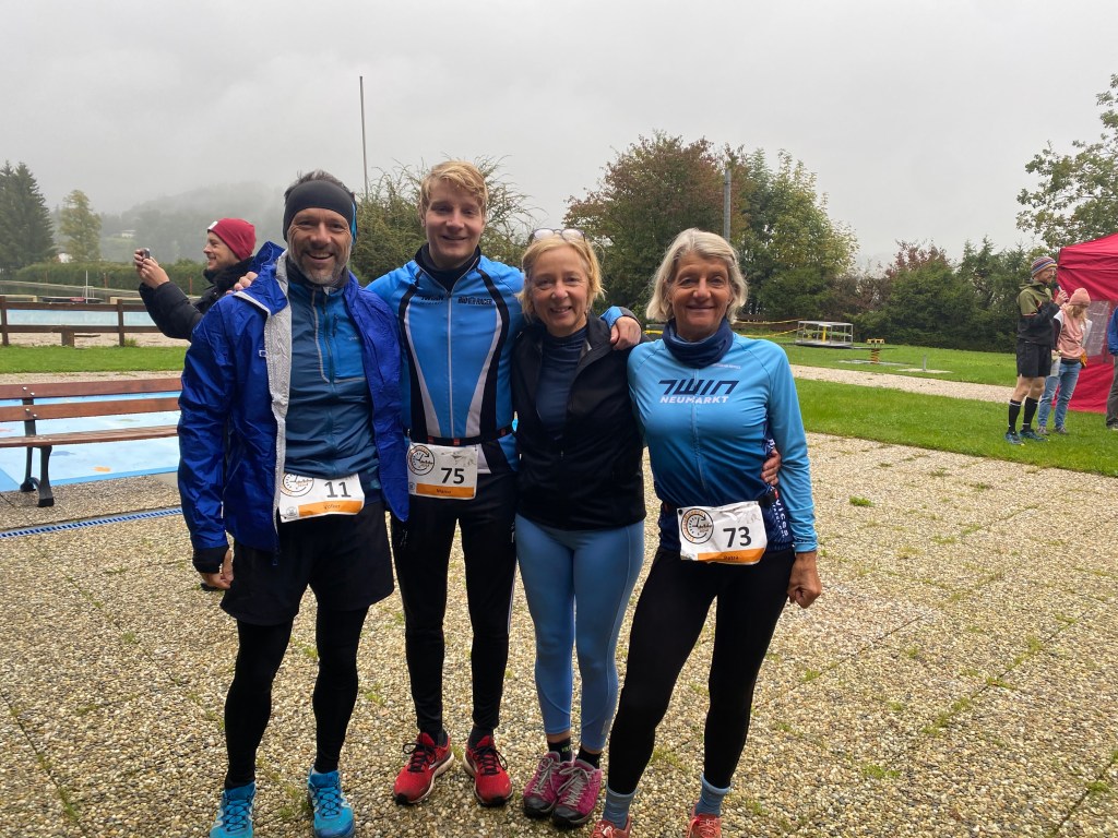 Was ist das? Ein24-Stunden-Runden Lauf mit einer Kombination verschiedener Laufformate. Die Zahl 100 deshalb, denn nach 24 Runden waren es 100 Meilen! Das hat das Interesse von ein paar Triathleten vom TWin Neumarkt geweckt und schon war man angemeldet. Samstag um 9 Uhr fiel der Startschuss und am Sonntag wieder um 9 Uhr war das Laufevent zu Ende. Volker Grötzner war dabei als Einzelstarter gemeldet, Petra Stiegler wollte unbedingt als Team starten und holte sich ihre Schwester Christa und Neffe Marco Petritzky mit „an Bord“. Logischerweise wurden die Runden von Volker einzeln gewertet und das Team durfte die jeweiligen Runden addieren. Es gab somit zwei verschiedene Wertungen. Für die Läufer von Neumarkt ein völlig anderes Wettkampformat, bei dem ist nicht so sehr auf die Geschwindigkeit ankommt. Es ging mehr um Ausdauer und Taktik. Insgesamt waren 100 Sportler gemeldet und nach 24 Stunden waren nur noch 5 Athleten unterwegs. Für jede Runde von 6,7 km hatte man genau 60 min Zeit, anfangs kein Problem. Die Ausdauerathleten von Neumarkt waren meist nach ca. 40 – 42 min im Ziel und hatten bis zur vollen Stunde Zeit zum Essen und Trinken usw. Wieder begann die nächste Runde und dies 24 Stunden. Volker wollte 14 – 16 Runden erreichen und war nach gut 85 km müde und glücklich im Ziel und es war genug. Das Ziel von Petra war für sie persönlich 10 Runden, also 67 km und auch das erreichte sie. Christa war mehr als zufrieden nach ca. 40 km und Marco wollte unbedingt 8 Runden erlaufen und schaffte ebenfalls sein vorgenommenes Ziel. Wetterbedingt war der Samstag im Chiemgau feucht und nicht besonders warm, jedoch am Sonntag strahlte die Sonne und natürlich auch die Teilnehmer.