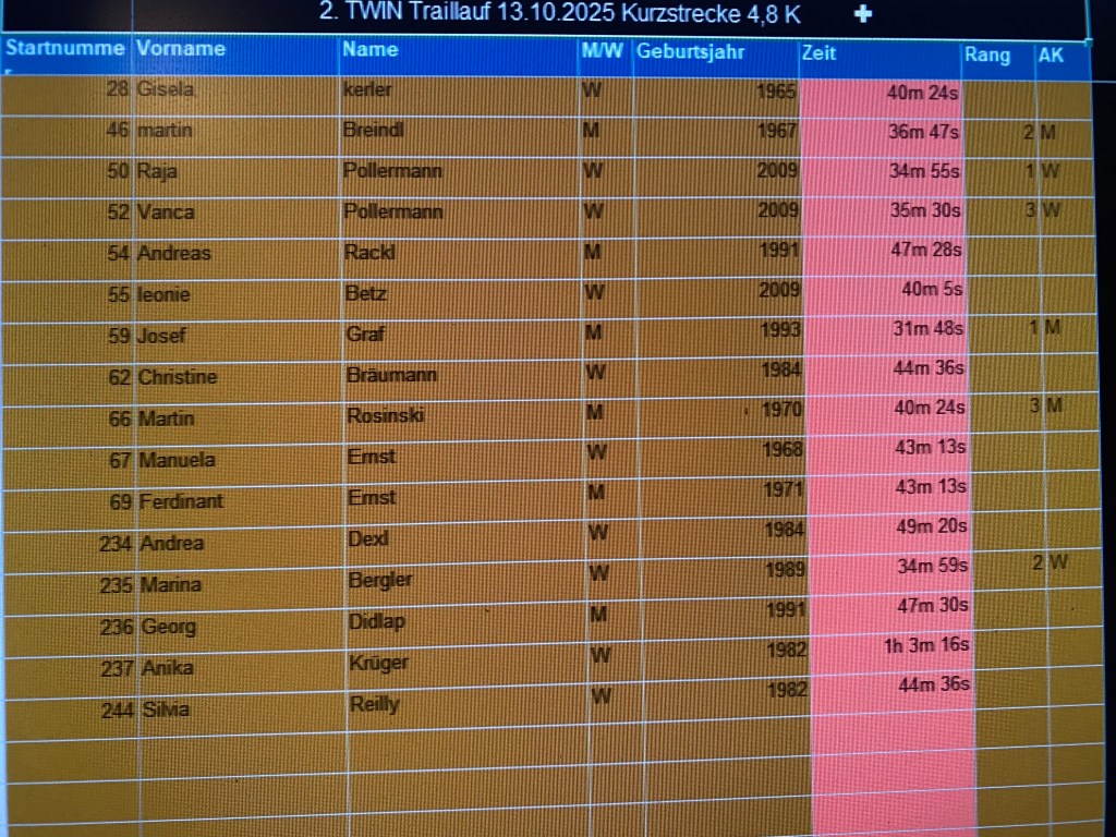 Mit viel Elan waren auch 12 Kinder angemeldet, welche den 3 km Trailkurs absolvierten und um gute Zeiten kämpften. Für alle Jungs und Mädels gab es im Ziel ein Medaille und wie auch bei den Erwachsenen einen Sachpreis. Die Verpflegung bot gesundes Obst und Riegel aber auch Kuchen und Kaffee. Für alle Beteiligten, ob Helfer oder Läufer eine etwas andere Veranstaltung.