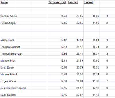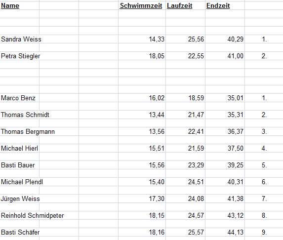 Es wurde in zwei Durchgängen, jeweils 1.000m geschwommen. Die Augen waren hier auf die Top-Schwimmer des Vereins gerichtet, welche hier die Minuten gut machen mussten, die beim anschließenden Lauf (nicht gerade die starke Disziplin der guten Schwimmer!) so wichtig waren um sich gegen die guten Läufer Benz und Hierl durch setzen zu können.